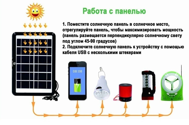 Сонячна панель для автономного заряджання пристроїв: мобільних телефонів, відеореєстраторів, GPS-навігатерів, планшетів, для фото- та відеотехніки, смартфонів. Вдома та на природі можна не турбуватися про брак електропостачання. Він дає змогу повністю використовувати сонячну енергію для заряджання різних електронних пристроїв. У комплекті USB дріт і 5 різних перехідників. Чудова заміна для різних батарей. Економія та зручність у подорожах.