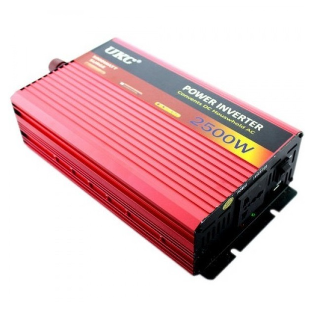 максимальна потужність: 2500 Вт; пікова потужність: 5000 Вт; частота на виході: 50/60 Hz; форма вихідного сигналу - ступінчаста апроксимація синусоїди; ККД 88%; температура довкілля при роботі: -10...+40°С; температура та вологість зберігання: -20...+55 С, 10%-95%RH; робоча вологість: 20%-90%RH (без конденсату); температурний захист; охолодження вентилятором; захист від короткого замикання; захист від перевантаження; 2 кулери охолодження; звуковий сигнал при низькій вхідній напрузі;роз'єм USB на виході; вимкнення при низькій вхідній та вихідній напрузі; вага: 1,5 кг; розмір: 24 х 15 х 7 див. Комплектація інвертора перетворювача: інвертор; комплект проводів для підключення від акумулятор